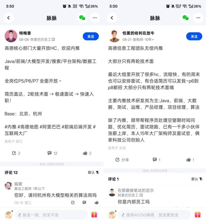 以8月高德发布AI地图为例,仅几日后,其相关内推招聘的帖子就在脉脉上密集出现。从业务更新再到内部员工自发挂出内推帖,一个“信号发酵—人才触达—岗位需求”的闭环迅速形成。
