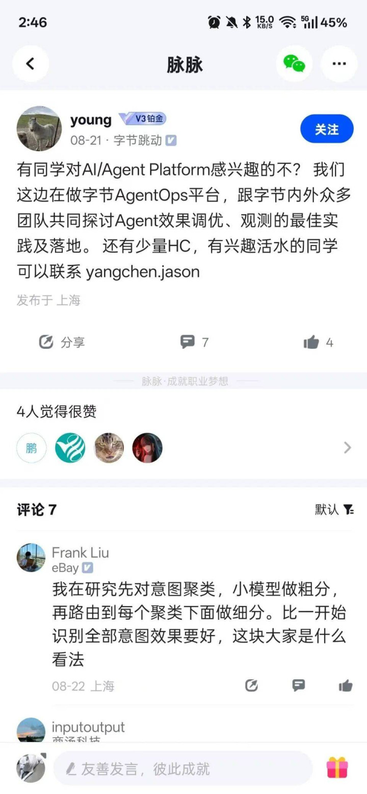 一方面,对内部员工而言,相比裸辞跳槽,内部活水显然是更优解,因此不少内部岗位调动需求,也直接在脉脉发帖流通。比如有字节员工发帖,面向“有AI兴趣的同学”寻求内部活水,打通从需求发布到快速匹配的组织内循环。