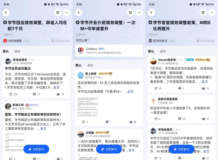 就在上月末,“百度涨薪”话题登上脉脉热榜。7月底,字节跳动举办了一场规格相当高的All Hands会议,一场会上了脉脉三个热榜话题。字节这次大会传递了三个核心信息点:一是鼓励打出更多“E”,放大对高绩效员工的正向激励;二是晋升机制改革,M+即可提名,缩短人才上升路径;三是弱化考核焦虑,明确“M”为“持续符合预期”,连续两次M-不再强制淘汰。