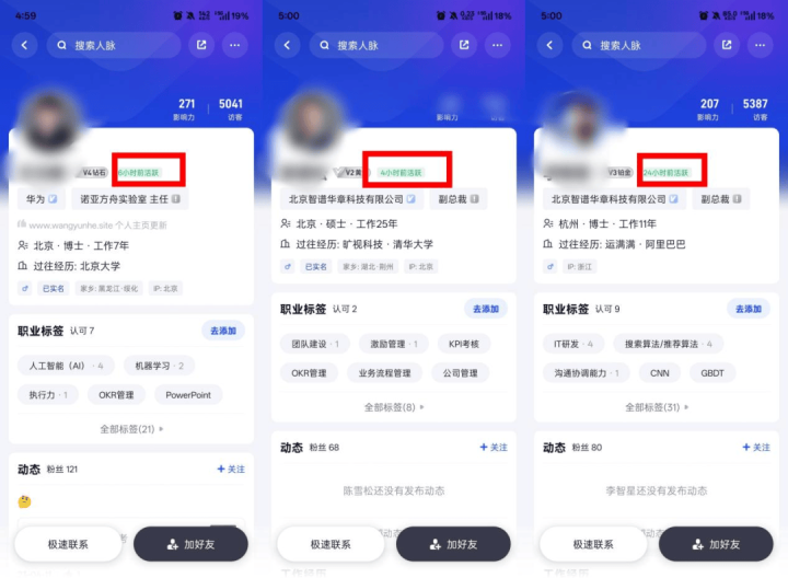 其次,「市象」注意到在脉脉这个平台,随机搜索一些典型的AI企业,就会发现AI人才活跃度颇高。以华为、智谱、DeepSeek等AI公司为例,可以发现不少核心员工都在24小时以内活跃过。